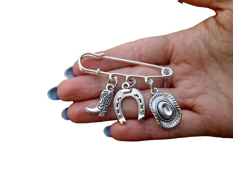 COWGIRL Safety Pin Brooch- SOUTHWESTERN Pin- Backpack Pin, Cowgirl Boots, Horseshoe, Cowboy Hat Charm, Rodeo Gift, Line Dancing