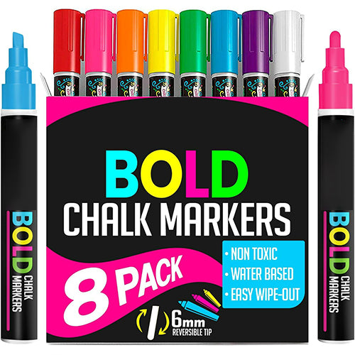 Liquid Chalk Markers for Blackboards - Bold Color Dry Erase Marker - Chalk Markers for Chalkboard Signs, Windows, Blackboard, Glass - 6mm Reversible Tip (8 Pack) - 24 Chalkboard Labels Included