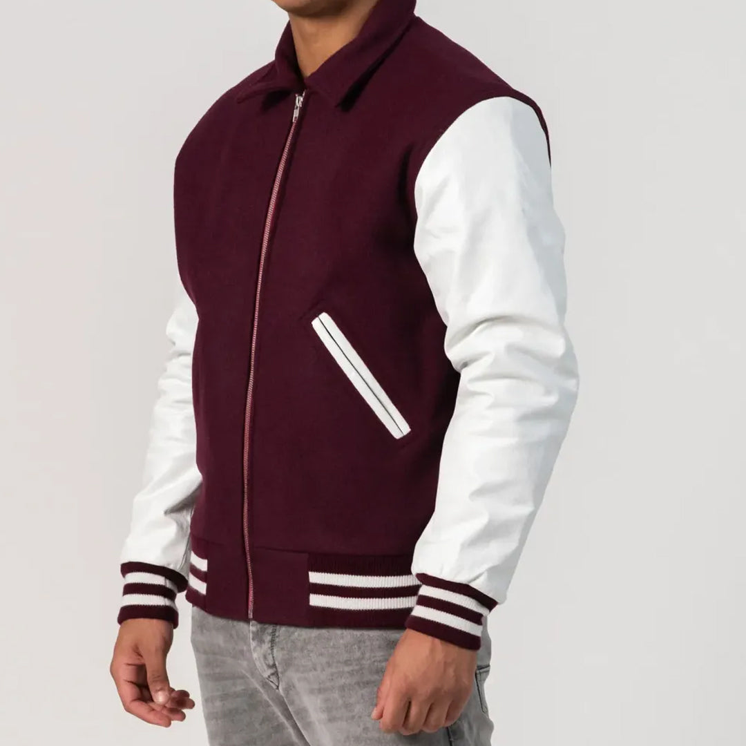 Maroon Body Varsity Jacket with White Sleeves, Byron Collar, and Zipper