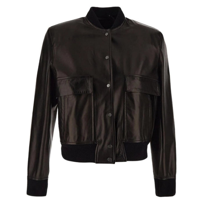 Refined Long-Sleeved Black Leather Bomber Jacket