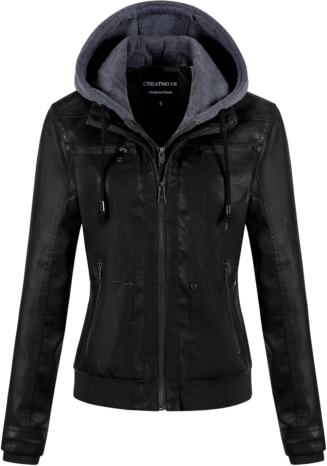 CREATMO US Women's Faux Leather Jacket Waterproof Motorcycle Bomber Jacket Vintage PU Moto Biker Coat With Removable Hood