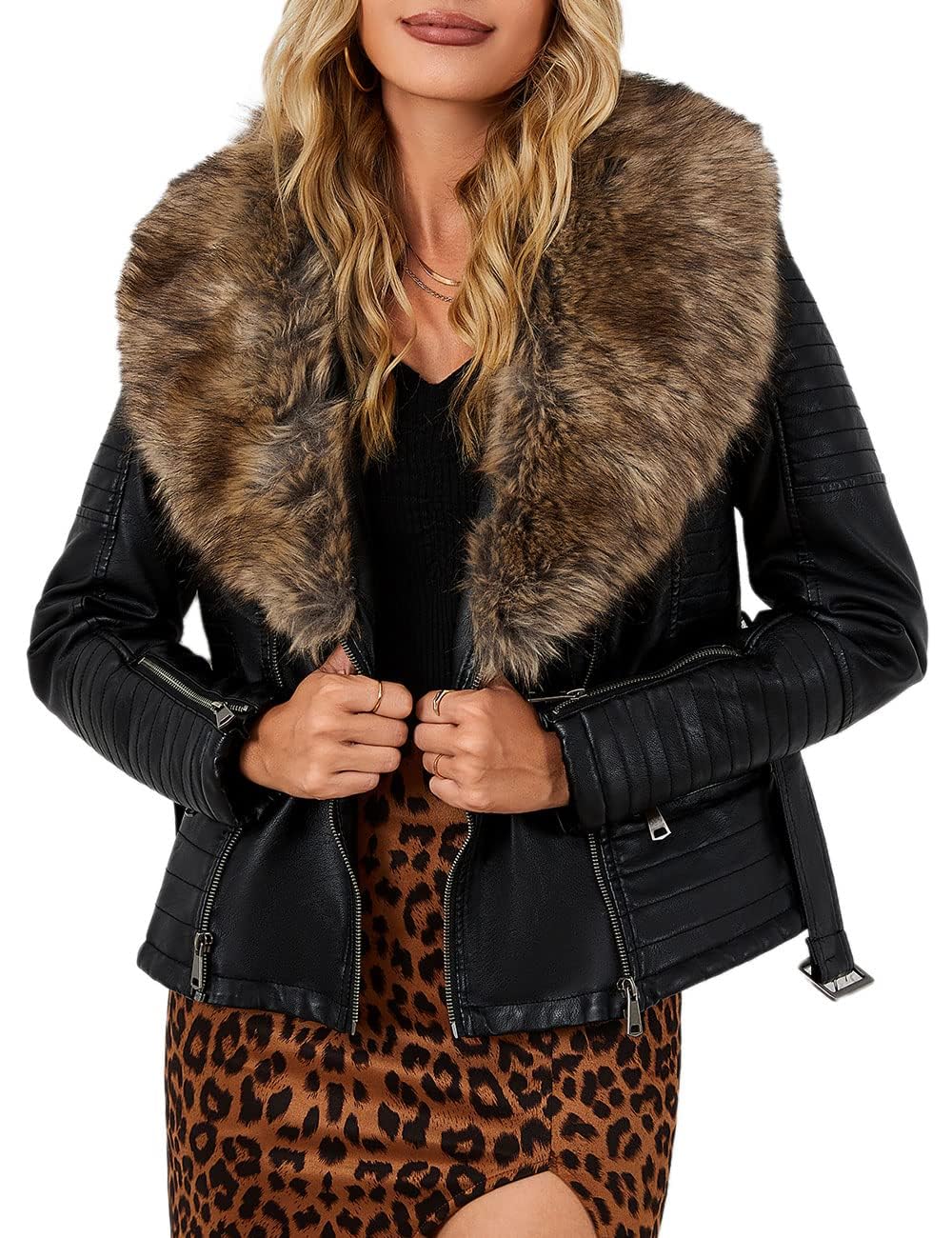 Bellivera Women's Faux Leather Jacket Moto Biker Sherpa-Lined Coat with Removable Fur Collar