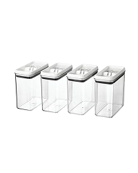 Keep your dry goods fresh with these Better Homes & Gardens Flip-Tite® Food Storage Containers. It is a handy item to have in your kitchen or pantry. These food storage containers are ideal for storing dry foods, such as pasta, dried beans, and candies. It’s made without Bisphenol A (BPA) to ensure the safety of your food. A clear storage container makes it easy to identify the stored contents at a glance without having to label each canister. It features an easy-to-open flip buckle lid with food grade safe seal and is made of durable construction. This 4 pack set includes 4 of 11.5-cup rectangular container and 4 lids. Always wash before first use and remove seal from lid before wash. Allow all components to dry thoroughly before next use. Container and lid are dishwasher safe, and the silicone seal is hand wash. Not Microwave safe. Do not carry Flip-Tite Container by the lid.