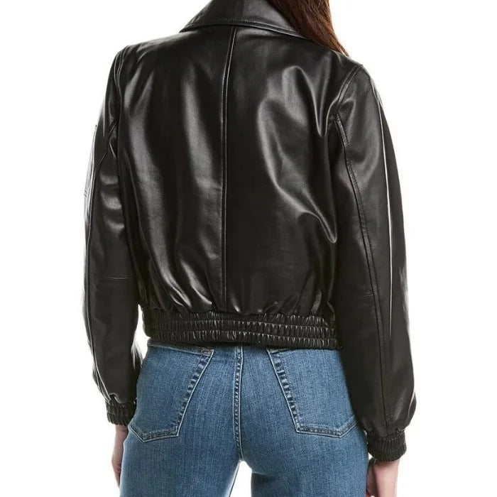 The Noelle Bomber Jacket wraps you in tailored luxury with sleek leather, multiple utility pockets, and a flattering cropped fit. Built for city life with a confident edge.